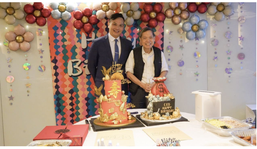 近日適逢葉主席牛一,行政總裁許繹彬先生及高級顧問黃健財先生率領全體同事,為主席舉辦一場盛大的生日派對,並送上寓意「龍行天下」的「金龍」擺飾作為生日禮物,象徵集團如龍般勇猛,在主席的英明領導及同事群策群力下,生意越做越好,業績再創高峰。