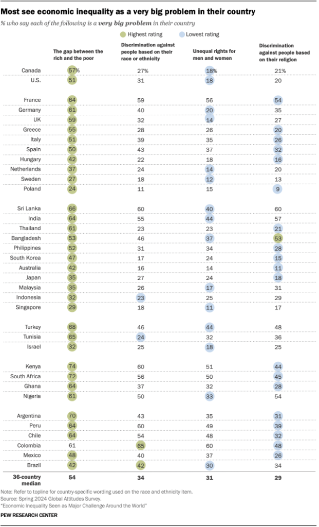 - A median of 54% across the countries surveyed say the gap between the rich and the poor is a very big problem. Smaller median shares say the same about the other types of inequality.