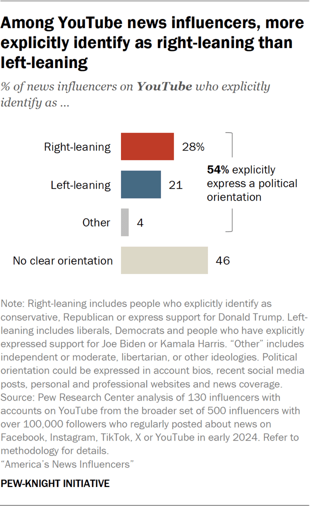 About half of all YouTube news influencers explicitly express a clear political orientation. Among those who do, a higher share are right-leaning (28% of all YouTube news influencers) than left-leaning (21%). Just 4% have some other kind of political orientation, and about half (46%) do not express any lean.