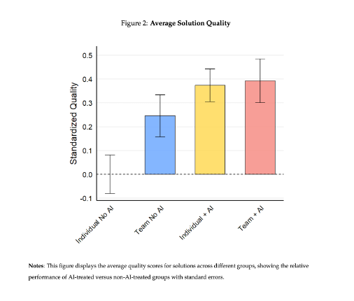In traditional settings, teams outperform individuals by integrating diverse perspectives. But what happens when an individual is paired with genAI? The study found that individuals using generative AI matched the performance of human teams working without it. More strikingly, teams with genAI outperformed everyone else, producing higher-quality, faster solutions with more comprehensive detail. We’re talking real business challenges that P&G employees tackle in their day-to-day work.