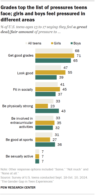 - Getting good grades: 71% of teen girls compared with 65% of teen boys say they feel a great deal or a fair amount of pressure to get good grades.