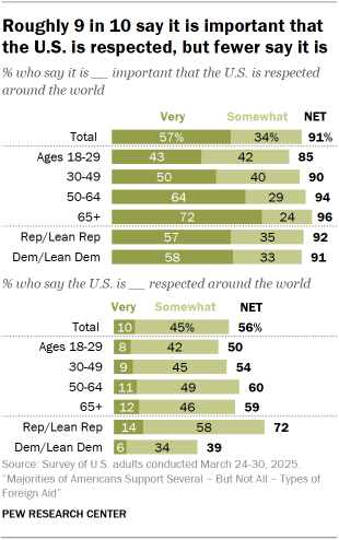 - While 91% say it is important for the U.S. to be respected around the world, a much smaller share (56%) say it is respected.