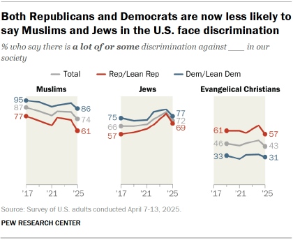 - 57% of Republicans say evangelical Christians face at least some discrimination, down from 67% in 2024.