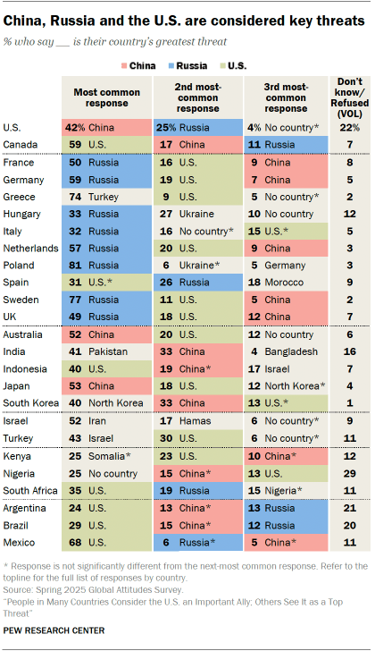 The U.S. is also seen as a threat across Europe. It is the second-most common response in six of the 10 European countries surveyed, and tied with Russia at the top in Spain. China is the third-most common answer in five European countries.