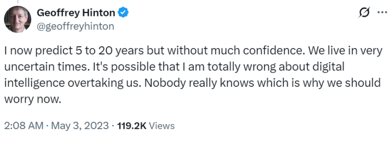 Before the appearance of large language models (LLMs) and ChatGPT, the median timeline projection for AGI was much longer than it is today. The consensus among experts and prediction markets placed the median expected arrival of AGI around the year 2058. Before 2023, Geoffrey Hinton — one of the “Godfathers of AI” and a Turing Award winner — thought AGI was “30 to 50 years or even longer away.” However, progress shown by LLMs led him to change his mind and said it could arrive as soon as 2028.
