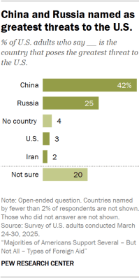 Roughly four-in-ten Americans (42%) say China poses the greatest threat to the U.S. when asked in an open-ended question. Russia is named by the next-largest share (25%).
