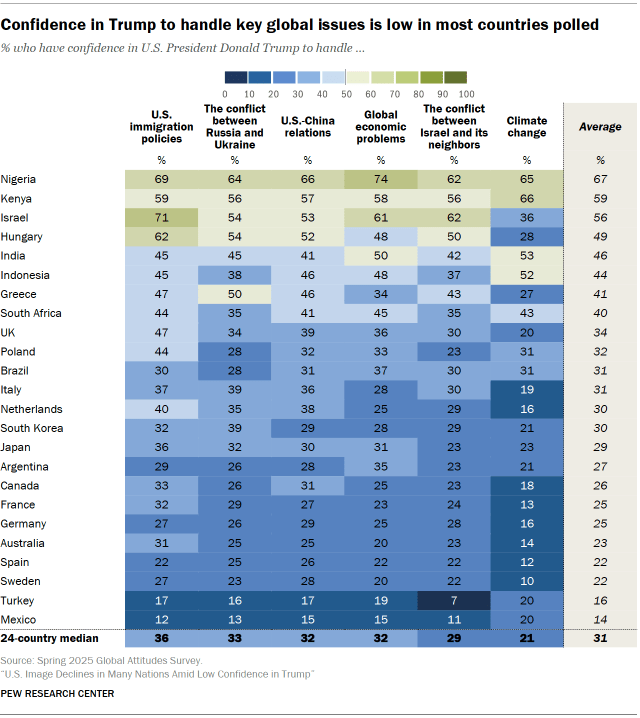 In most other countries, confidence in Trump’s handling of the economy is limited. This is particularly the case in Mexico, where the survey followed weeks of shifting tariff policies affecting Mexican imports.