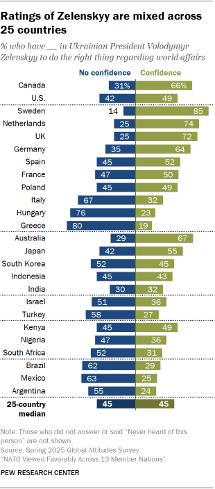 Views of Ukrainian President Volodymyr Zelenskyy are evenly divided across the 25 countries surveyed. A median of 45% of adults in these countries say they have confidence in him to do the right thing regarding world affairs, while an identical median share lack confidence in him.