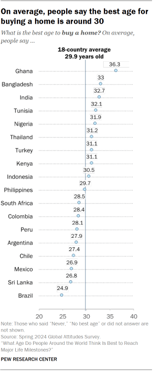 Brazilian adults suggest the youngest age for this life event (saying 24.9 years old is best, on average), while Ghanaian adults suggest the oldest age (36.3). Across the 18 mostly middle-income countries surveyed, people think the best age to buy a home is 29.9.