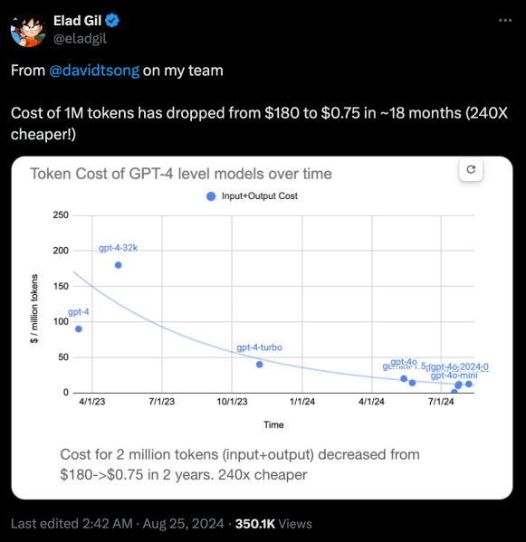 In the past year, the costs of frontier models have steadily decreased. The price per million tokens of OpenAI’s top-performing large language model (LLM) has dropped by more than 200 times in the past two years.