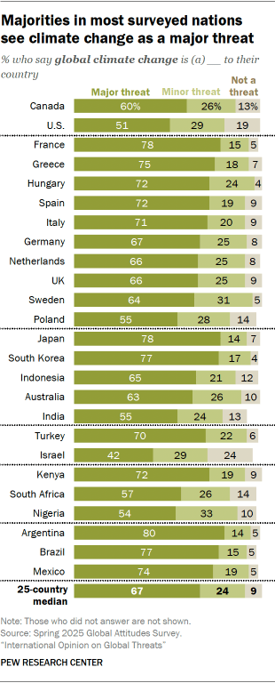 - A median of 67% of adults across 25 nations say global climate change is a major threat to their country. Another 24% say it is a minor threat, and 9% say it is not a threat.