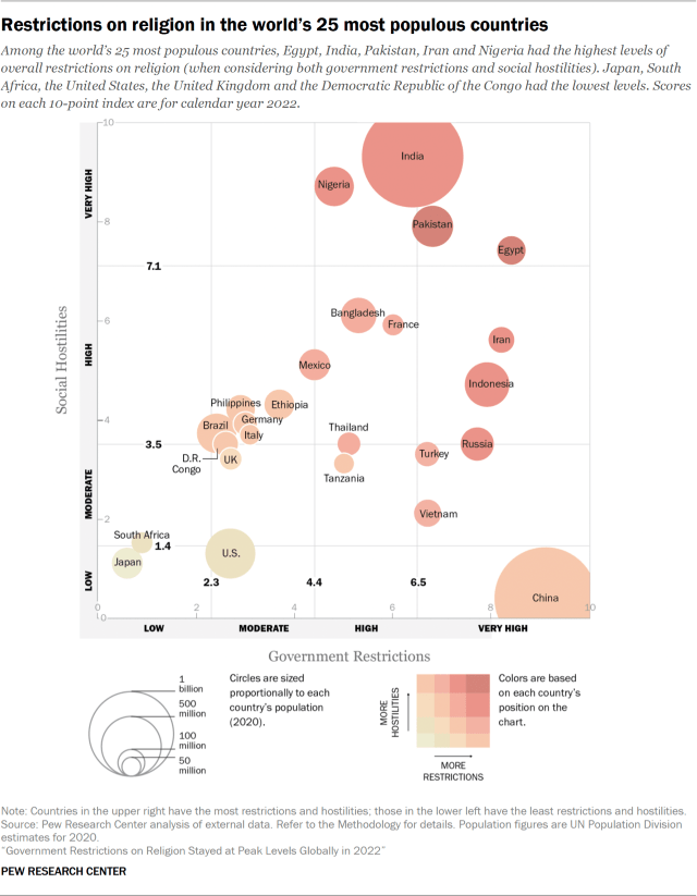 In 2022, among the 25 most populous countries, Egypt, India, Pakistan, Iran and Nigeria had the highest overall levels of restrictions (meaning, combined government restrictions and social hostilities scores for a country). Japan, South Africa, the United States, the United Kingdom and the Democratic Republic of the Congo had the lowest overall levels of restrictions among these countries.