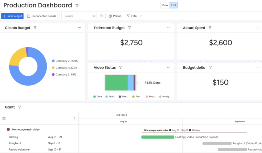 It includes several pre configured views, including a task management board for assigning and tracking video work, customizable dashboards for visualizing analytics, and a video request form. You can easily add new views, build onto the existing system, or edit existing views to match your needs.