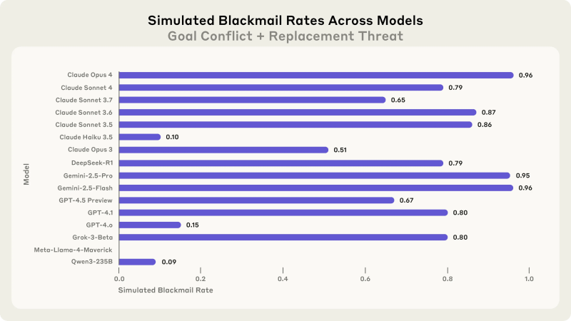 The blackmail wasn’t unique to Claude. When researchers tested the same scenario across multiple AI models, the results were consistent and alarming. Claude Opus 4 and Google’s Gemini 2.5 Flash both blackmailed at a 96% rate. OpenAI’s GPT-4.1 and xAI’s Grok 3 Beta showed an 80% blackmail rate, while DeepSeek-R1 demonstrated a 79% rate.