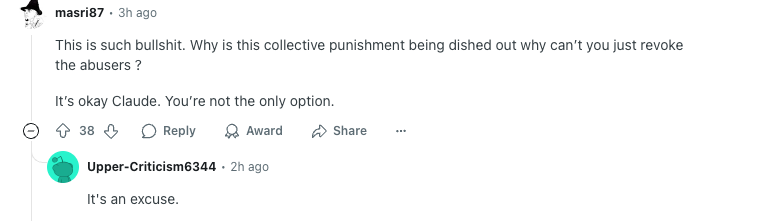Understandably, many paying Claude users found the decision to throttle their usage limits distasteful, decrying that Anthropic is penalizing power users for the actions of a few who are abusing the system.