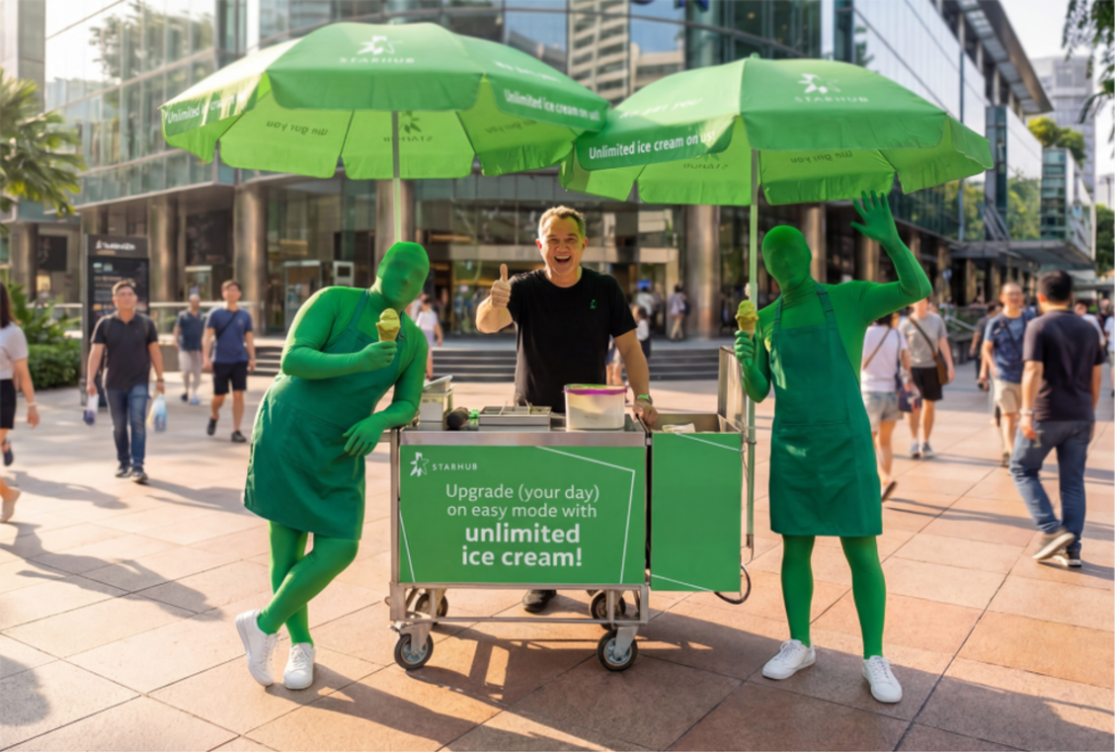 Just this week, Tiger Brokers enlisted men in bright yellow spandex to challenge strangers to pull-ups, sprints and broad jumps in unbranded teaser activations around Bedok Reservoir and Collyer Quay. The activation aimed to nudge participants toward its “Where’s your next step” campaign. Meanwhile, StarHub’s “Hublings” took over Orchard Road in March, handing out unlimited matcha ice cream to bring the telco’s “We got you” promise to life. For the uninitiated, the Hublings are a cast of non-speaking characters clad in green spandex, representing the brand’s reliability and care.