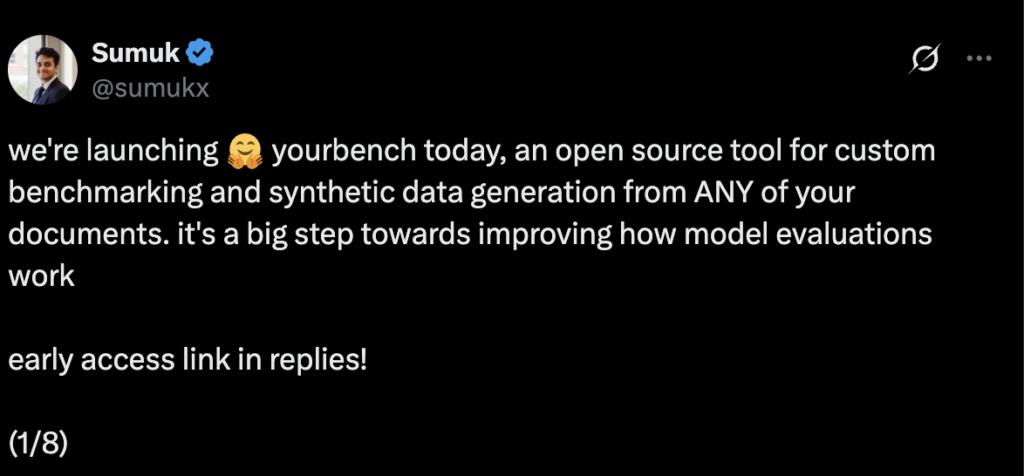 Sumuk Shashidhar, part of the evaluations research team at Hugging Face, announced Yourbench on X. The feature offers “custom benchmarking and synthetic data generation from ANY of your documents. It’s a big step towards improving how model evaluations work.”