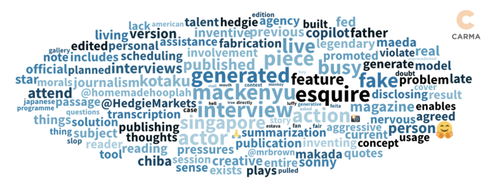Further analysis by CARMA also surfaced concerns around consent and representation, trust and erosion of credibility, and labour and craft. Keywords included terms such as “violate” and “morals” reflecting that netizens view AI-generated interviews as a form of unauthorised representation.