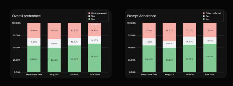 Impressively, Google says that on its own internal tests gauging “overall preference” (i.e. which videos an audience liked better) and “prompt adherence” (how well the videos matched the instructions given by the human creator), Veo was preferred by human evaluators to Sora and other rival AI models.