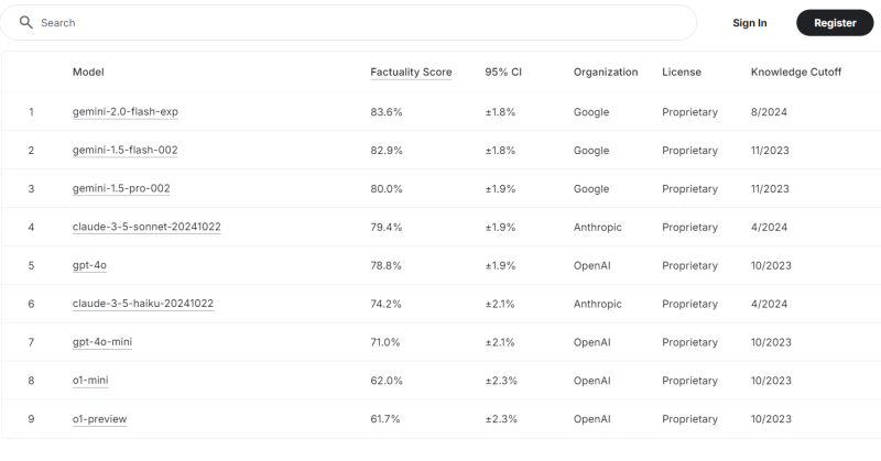 As of this week, Gemini 2.0 Flash topped the leaderboard, with a factuality score of 83.6%. Others in the top 9 include Google’s Gemini 1.0 Flash and Gemini 1.5 Pro; Anthropic’s Clade 3.5 Sonnet and Claude 3.5 Haiku; and OpenAI’s GPT-4o, 4o-mini, o1-mini and o1-preview. These all ranked above 61.7% in terms of accuracy.