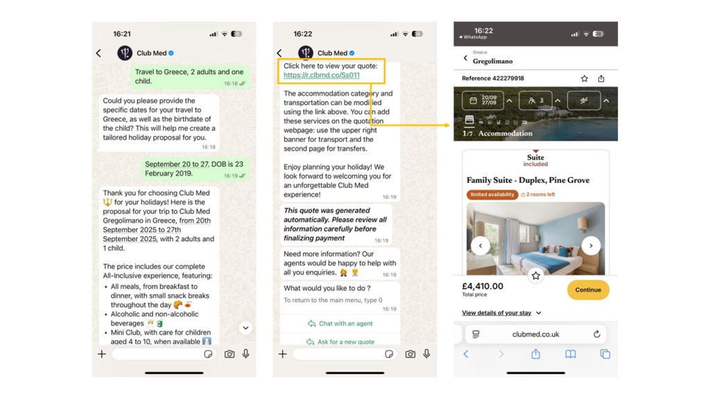We prioritize markets based on WhatsApp adoption and volume. Initially, we launched WhatsApp and AI together in Brazil and Belgium. Now, every WhatsApp rollout includes AI, with a two-week gap to analyze local queries for better performance. Our AI was built after analyzing call center data across markets, identifying 2 key question categories: product and pricing. The first two agents — product information and pricing — cover about 70% of customer queries. Pricing is complex, requiring real-time API calls and contextual explanations (e.g., why one resort costs more than another). Once a customer receives product and pricing info, we generate a prefilled booking link: This eliminates the need to manually search and input details, making the booking process much faster and more seamless.