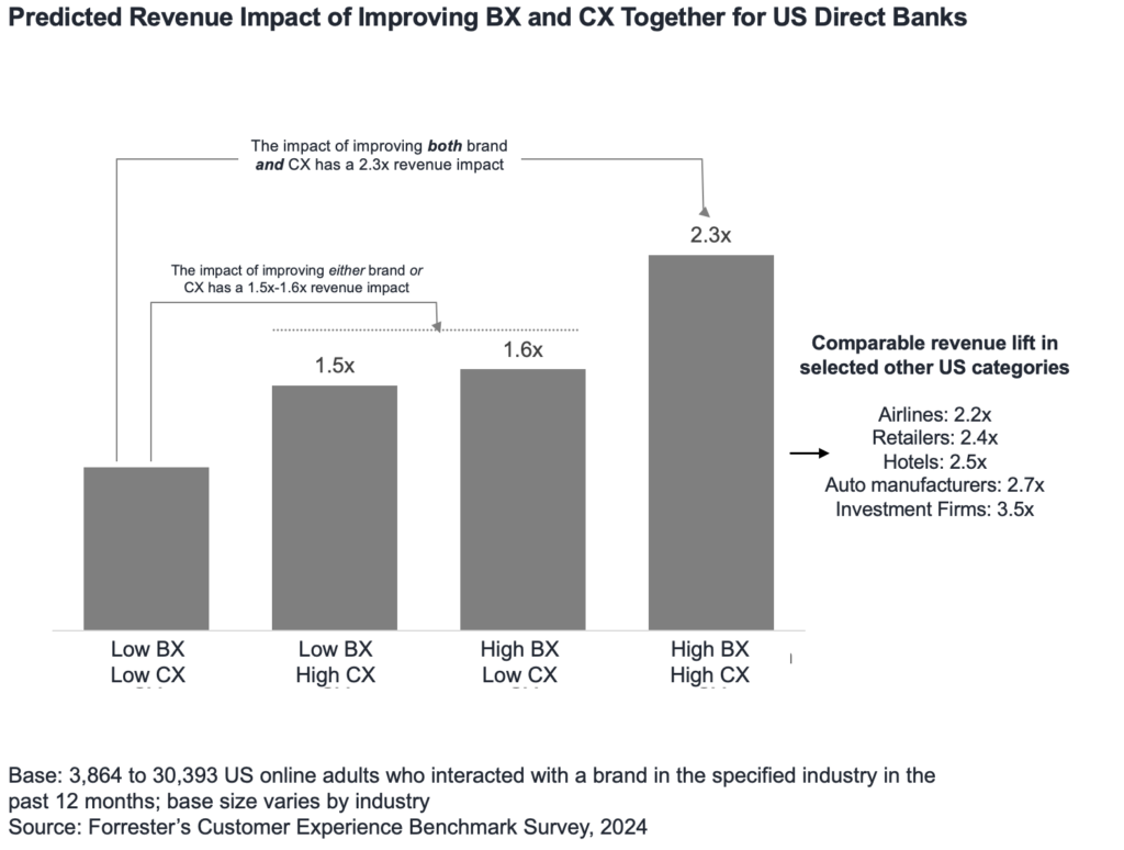 What’s new from Forrester is that we have clear and compelling evidence showing that brand experience and customer experience work more effectively together to generate financial value. Our analyses across various categories indicate that enhancing both BX and CX has a multiplicative revenue impact compared to advancing just one of them. For instance, in direct banks in the US, the combined revenue lift is 2.3x (versus 1.5–1.6x). The same multiplicative effect is observed in airlines, retail, auto, and numerous other industries.