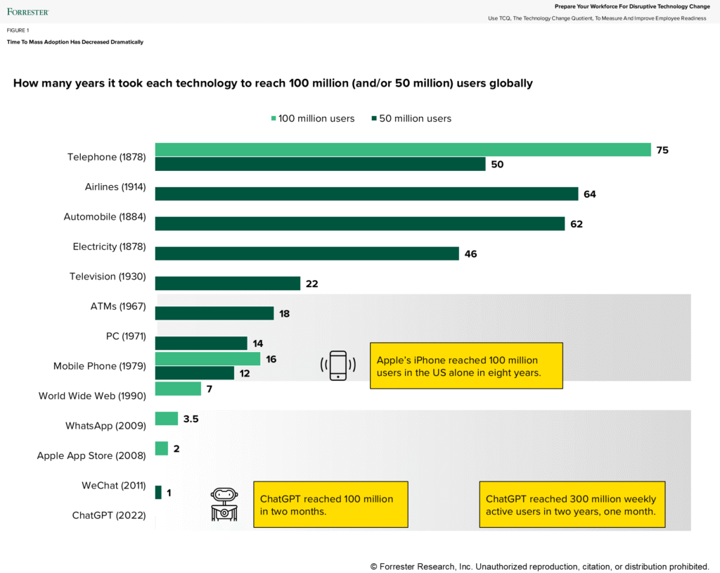 Consider the history of technology adoption (see figure below). While it took 50 years for 50 million people to use the telephone (1878), it only took 22 years for television (1930) to reach the same penetration. Yet the iPhone (2007) reached 100 million users in the US alone in just eight years. Fast, right? Not as fast as today. How about WeChat (2011), which took only one year to reach 50 million users, or ChatGPT (2022), which reached 100 million in two months?