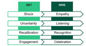 - When you feel engaged and “in it,” celebrate your progress and success. Reward yourself for reengaging. Model your mindset shift and positive energy with others so that they see the benefits of engaging. Influencing their behavior will be the biggest reward of all. Now you’re ready to lead through change sustainably and authentically.