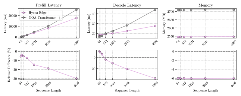 Prefill latencies at short sequence lengths also outpaced the Transformer baseline — a critical performance metric for responsive on-device applications.