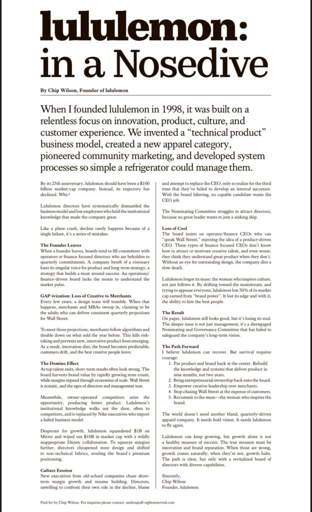 In his paid ad placement titled lululemon: in a nosedive, Wilson said that lululemon should have been a US$100 billion market-cap company, but its trajectory has declined as “lululemon directors have systematically dismantled the business model and lost employees who held the institutional knowledge that made the company great.”