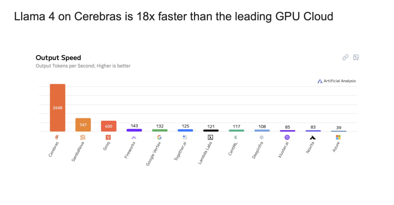 What sets Meta’s offering apart is the dramatic speed increase provided by Cerebras’ specialized AI chips. The Cerebras system delivers over 2,600 tokens per second for Llama 4 Scout, compared to approximately 130 tokens per second for ChatGPT and around 25 tokens per second for DeepSeek, according to benchmarks from Artificial Analysis.