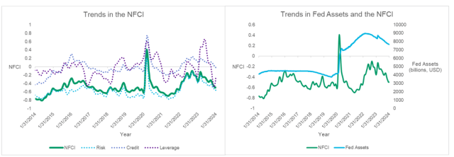 We examined weekly data for the Federal Reserve Bank of Chicago’s National Financial Conditions Index (NFCI) from 31 January 2014 through 31 January 20241. The NFCI measures the state of financial conditions, consisting of 105 indicators of risk, credit, and leverage2. We also obtained weekly data for the risk, credit, and leverage subindexes from the NFCI over the same period3. Similarly, we gathered weekly data on the Fed’s balance sheet from 31 January 2014 through 31 January 20244.