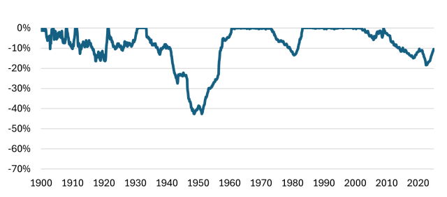 An investor is always either at an all-time high or in a drawdown. Most stock market investors are aware of this. Stocks can really disappoint in both the short-term and the long-run. The Great Depression wiped out nearly -80% of real wealth invested in the US stock market. Even after a strong recovery, it took many years, even decades, for most investors to fully heal. Not every dip is followed by a swift recovery. Inflation, often overlooked, can further erode real returns, even when stock markets go up in nominal terms.