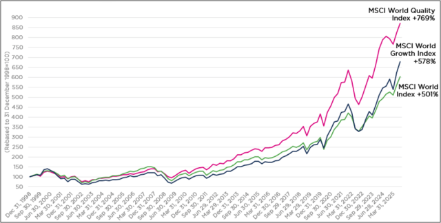 Figure 1: Stock market performance (31 December 1998-30 September 2025). Over the long term, quality shares have significantly outperformed the broader stock market.
