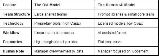 The edge today no longer comes from building proprietary AI models — it comes from how firms use them. Instead of sinking capital into in-house development, CIOs should license multiple best-in-class external models and focus on the true differentiator: implementation. That means knowing which models to use, where to deploy them in the investment process, and how to combine their outputs effectively. A firm’s real intellectual property now lies in its prompt library — the tailored workflows that embed its investment philosophy into general-purpose models. This Human+AI approach shifts spending from heavy CapEx to flexible OpEx, often at a modest cost of roughly $500 to $5,000 per model per month and requires continuously monitoring the AI landscape so new and better models can be tested and integrated as they emerge. - The New Process: A Four-Stage Human+AI Funnel