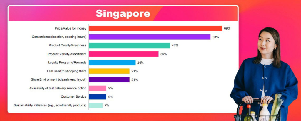 Price remains king in Singapore’s grocery choices. Nearly seven in 10 shoppers say value for money is their top priority, followed by convenience and product freshness. Yet sustainability initiatives barely register, with only 7% considering it important.