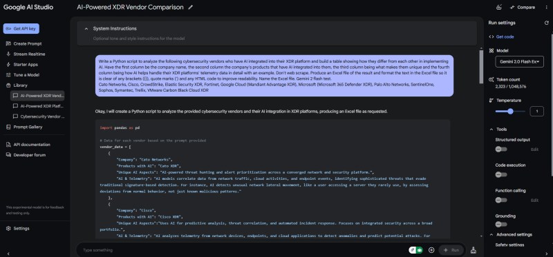 Using Google AI Studio, VentureBeat created the following AI-powered XDR Vendor Comparison Python scripting request, with Python code produced in seconds: