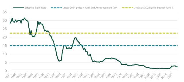 Yale BudgetLab and Northern Trust Asset Management – Quantitative Strategies. The effective US tariff rate is measured as customs duty revenue as a percent of goods imports. The sample period is 1875-2024.