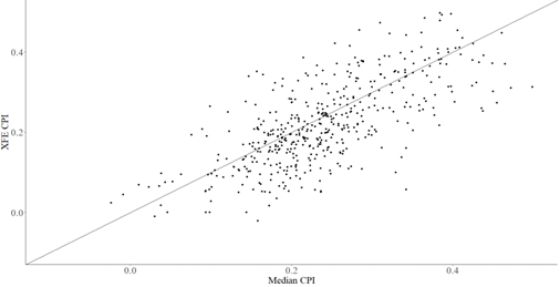 The charts in the panels of Exhibit 1 give a sense of the frequency and size of non-XFE shocks. The scatterplot shows monthly XFE versus median inflation. When they’re equal, points lie on the 45-degree line. Pairs above the 45-degree line are positive non-XFE shocks and vice versa. (The R-code used to produce charts and perform analysis presented in this blog can be found on an R-Pubs page). The histogram shows the distribution of these shocks. Large disturbances are rare.