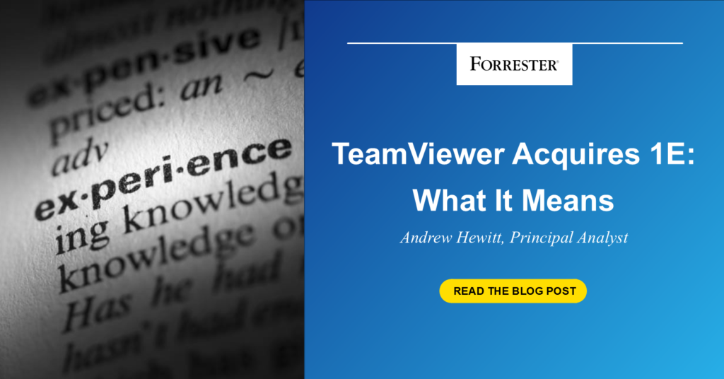Proactive IT is a frequent subject of client inquiry. Most customers today, however, have different tools for managing different phases of the IT support lifecycle. The acquisition combines 1E’s proactive approach to IT support with TeamViewer’s leadership in reactive remote control. Theoretically, this will enable customers to source best-of-breed capabilities from a single vendor. Typically, this is not possible today without sacrificing the quality of either the EUEM or remote control product, but customers will still need to supplement these capabilities with third-party service management and conversational AI tools to bring proactive IT to life.