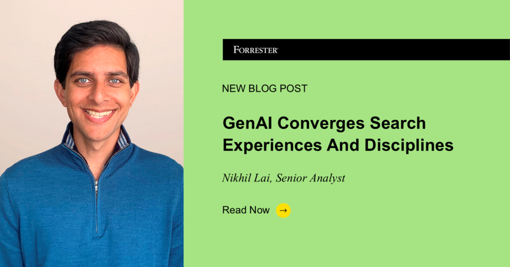 Our latest report — GenAI Forever Changes All Forms Of Search — details how to do all that and more. It’s a first-of-its-kind collaboration across Forrester’s B2C marketing, B2B marketing, commerce search, and cognitive search subject-matter experts. We look forward to your feedback and helping marketing, digital, and technology leaders and processes adapt to genAI-integrated search.
