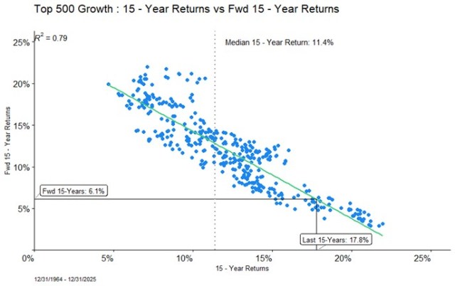 For cap-weighted and growth portfolios, the regression lines showed a pronounced negative slope: periods of exceptional trailing returns were typically followed by much lower forward returns. For example, over the last 15 years the Top 500 Growth delivered 17.8%, but the forward 15-year expectation is just 6.1%. This pattern is consistent with valuation mean reversion and the cyclicality of market leadership.