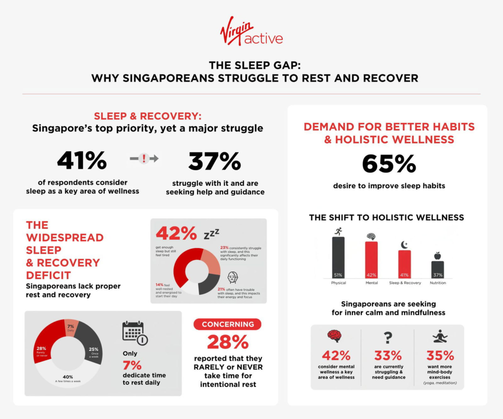 The push is grounded in findings from Virgin Active’s Wellness Trends Survey 2026, which polled 1,000 Singaporeans aged 25 to 65. The study revealed that while 41% view sleep and recovery as key to wellness, 37% struggle to maintain it — with nearly half (44%) consistently battling poor sleep. Another 28% said they rarely or never make time for intentional rest.