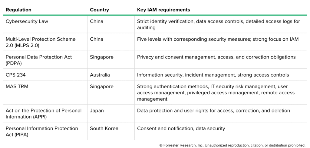 - Fragmented regulatory requirements. Countries in APAC have varying IAM requirements (see figure below). Businesses that operate in multiple countries across APAC need IAM solutions that support compliance, data protection, and security to avoid penalties.